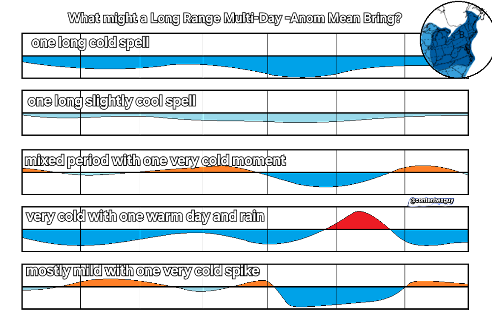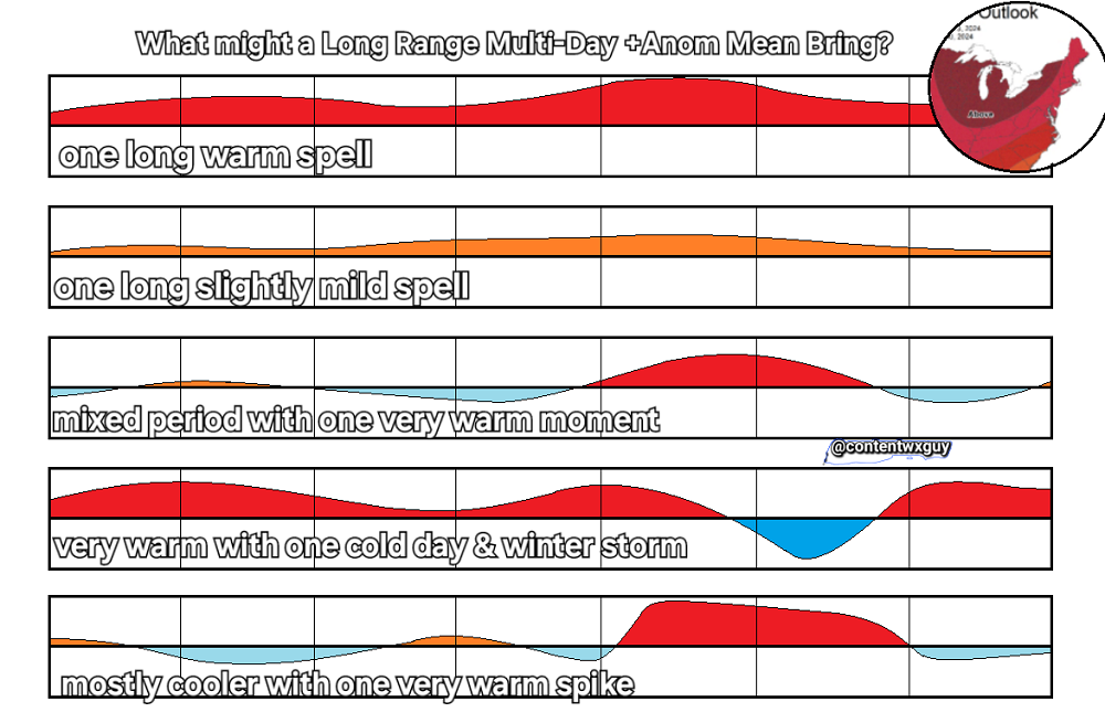 These outlooks are probabalistic maps intended for agricultural purposes. They are frequently presented as evidence of a coming weather pattern that might include or rather exclude a sought after event. For example if looking for a winter storm you may feel the requirement of a cold long range outlook. A warm one may be misinterpreted as a non-starter for winter weather conversation when in reality a proper thermal environment could exist within the broad high probablilty positive anomaly outlook. Below are some theoretical examples of how you might achieve a long range temperature mean yet possibly miss the true daily process at hand. |